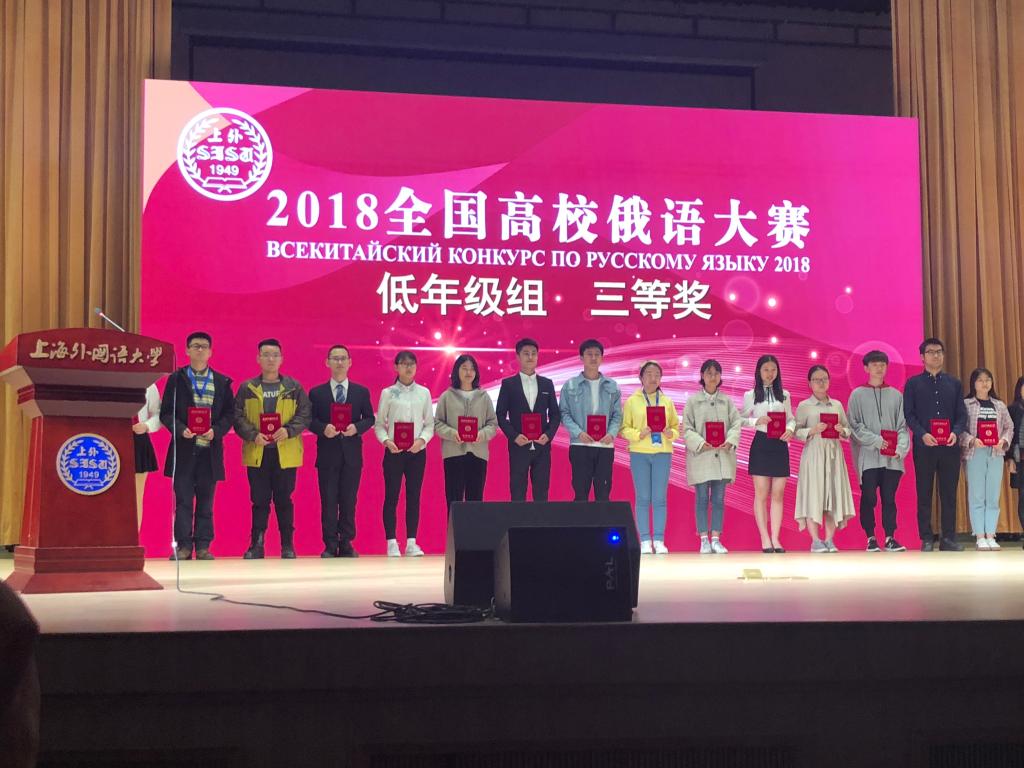 2018年10月26日至28日第11届全国高校俄语大赛在上海外国语大学隆重举行,我院俄语系共四名同学参加了本次大赛。经过激烈角逐,我院选手凭借雄厚的实力和敏捷的思维,取得了优异成绩。2017级种悦瑶、李想同学获得低年级组三等奖,2015级张蕴朦同学获得高年级组二等奖(在全国147名选手中位列第三)。上述三名参赛选手将由国家留学基金委管理委员会秘书处全额资助赴俄罗斯进修或攻读学位。