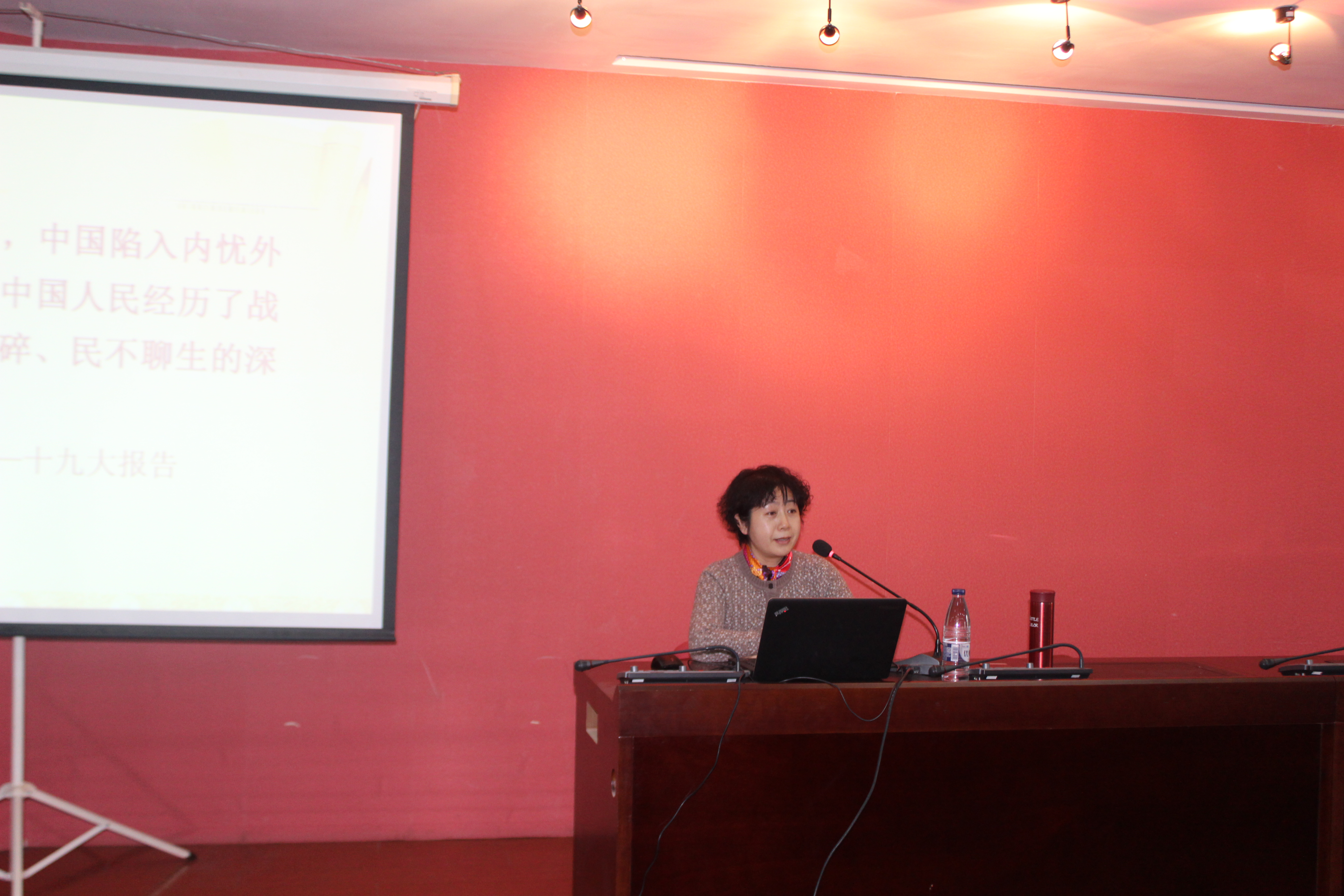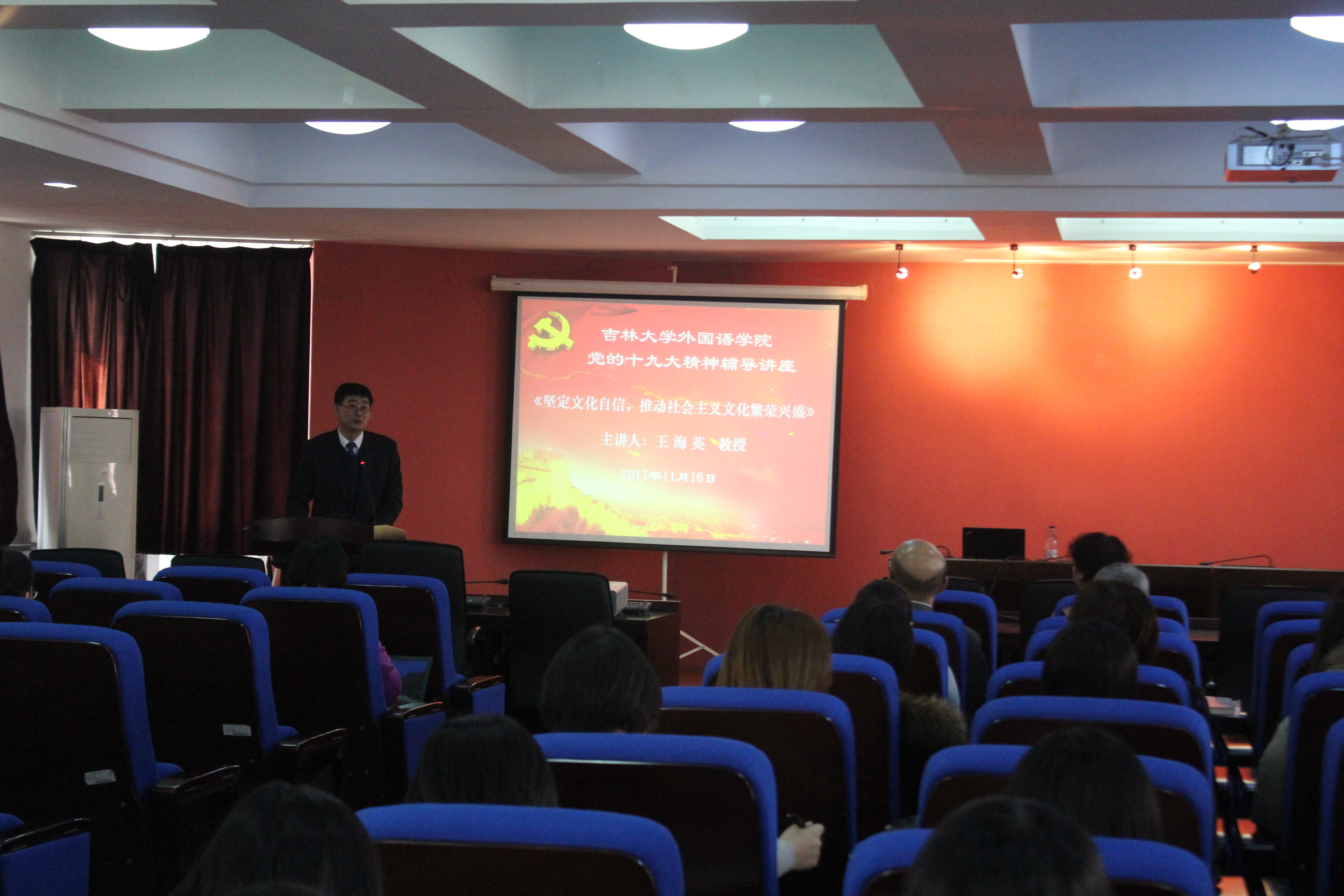 2017年11月16日下午,Betway(中国体育·必威)唯一官方网站党委学习十九大精神辅导讲座在外语楼500报告厅举行。本次讲座邀请到吉林省委党校哲学教研部主任王海英教授,她以《坚定文化自信,推动社会主义文化繁荣兴盛》为题,对十九大报告的内容做了解读。讲座由院党委书记刘昌松老师主持,Betway(中国体育·必威)唯一官方网站全体师生党员参加了讲座。