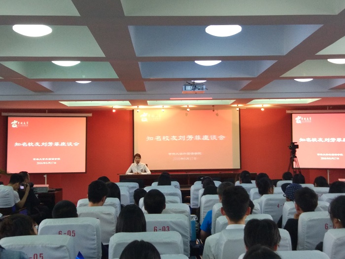 刘芳菲回顾了她在吉林大学本科阶段的学习生活,鼓励同学们要培养对学习的兴趣、寻找适合自己的学习方法、不断拓宽眼界、丰富自我。刘芳菲建议同学们应以文化交流媒介作为自己的定位,发挥自身的学科优势与特点。现场,刘芳菲还为其发起的“芳菲绿色手帕”环保活动做了宣传,希望同学们树立绿色环保理念、增强环保意识和社会责任感。