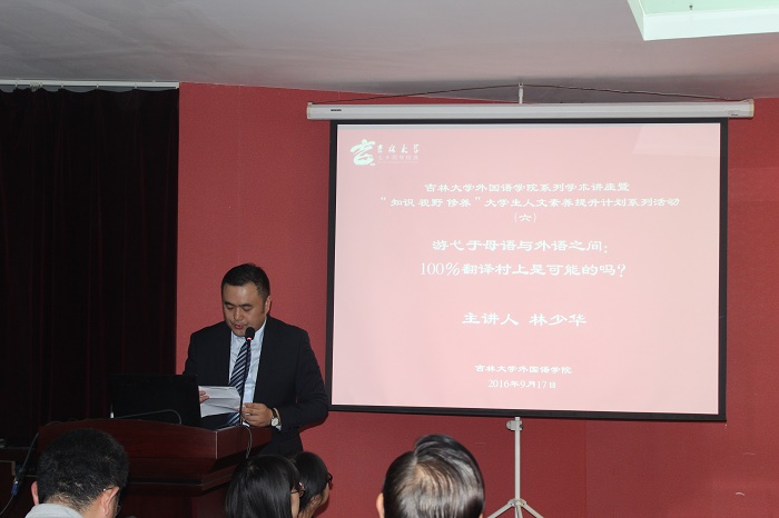 本次讲座主题为“游弋于母语与外语之间:100%翻译村上是可能的吗?”讲座开始前,周异夫院长对林少华教授的学术成就做了高度评价,并提出翻译是译者对原作的诠释,称赞林少华的译作在反映了村上春树语言特点的同时,糅合了自己的语言风格。在讲座中,林少华讲述了自己在研究生考试中深得恩师王长新赏识的故事,并以游子归家作比,表达了自己对吉林大学的感激。讲到自己的译作时,林少华坦言他的翻译应当是独树一帜的,“即便是错,也错的别具一格”;林少华教授从母语、外语和文体三个方面展开了对翻译的讲述。