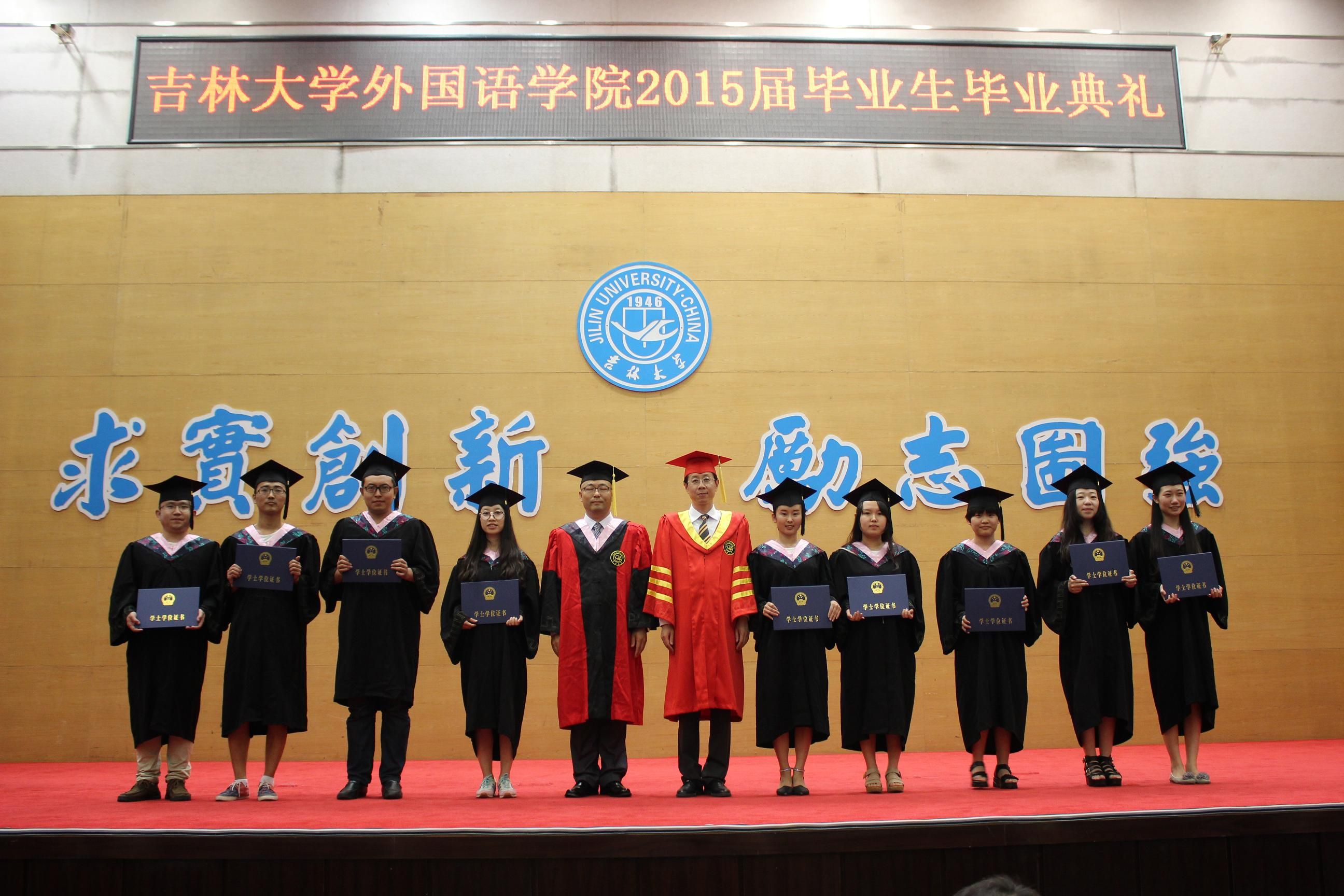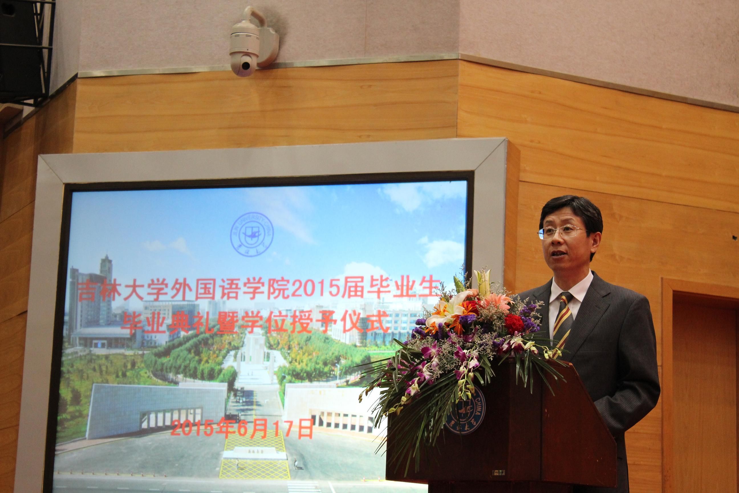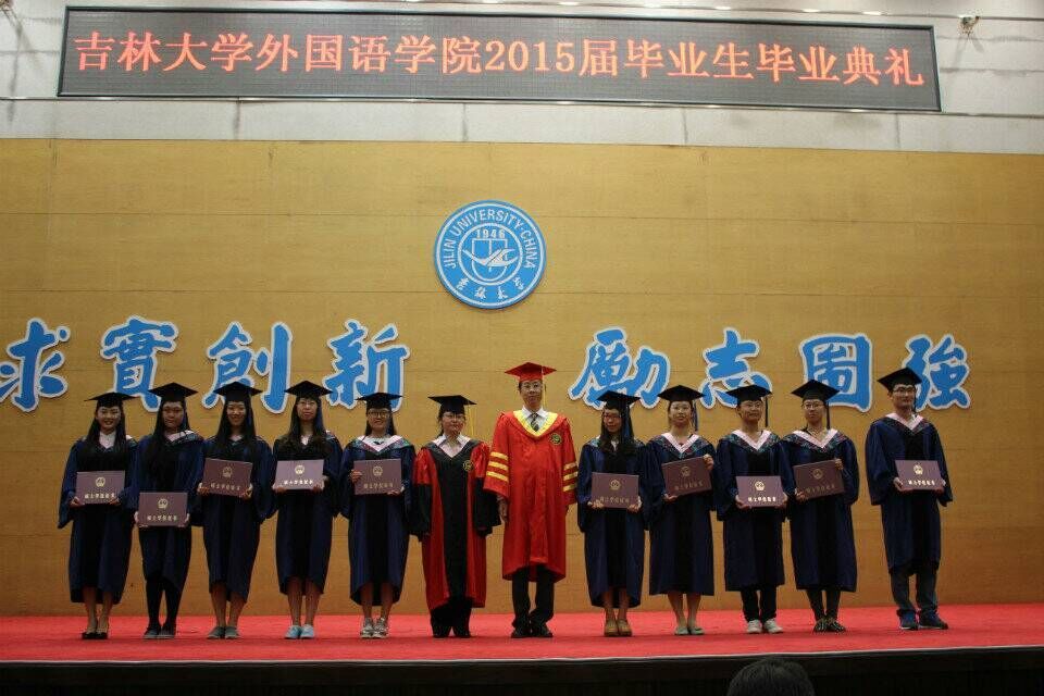 最后,院长周异夫教授发表了热情洋溢的讲话。他对圆满完成学业的毕业生们表示祝贺,对全院教职员工的辛勤工作表达了敬意,同时对离校在即的弟子们提出了殷切希望:第一,要以坚韧的意志,百折不挠,乐观面对失败,昂扬向上,锐意进取,成为社会精英;第二,要以持之以恒的态度,不忘学习,坚持锻炼,强健体魄,健全人格;第三,要以勇于担当的胸怀,心怀天下,薪火相传,不但做“中国梦”的践行者,更是“中国梦”的见证者。同时,周院长希望同学们能够始终关注母校、热爱母校,把兼容并包、积极进取的吉大外院精神传承并发扬光大。师生们无不为院长的精彩讲话所感动,热烈的掌声经久不息。在吉林大学校歌声中,Betway(中国体育·必威)唯一官方网站2015届毕业生毕业典礼暨学位授予仪式圆满结束。