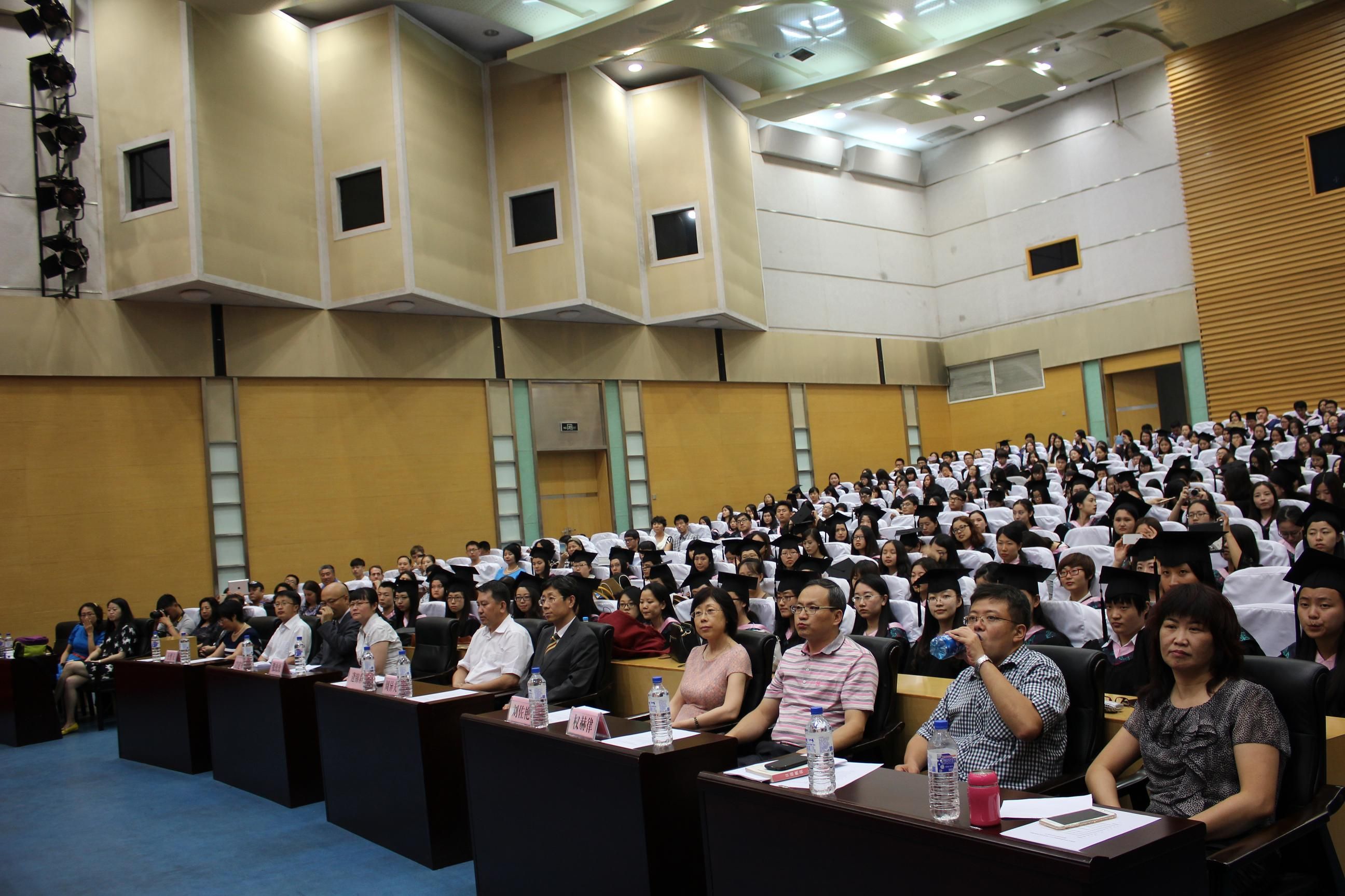 毕业典礼在庄严的国歌声中开始,副院长胡建军副教授和张玫玫教授分别宣读了本科生和研究生毕业生名单。周异夫院长、胡建军副院长、张玫玫副院长为本科生和研究生毕业生授予学士、硕士学位并颁发学位证书。随后,毕业生代表发言,教师代表英语系许京兰教授致辞。毕业生代表饱含深情,向学院领导和老师表达了诚挚的感激和留恋之情;教师代表情真意切,为毕业生们送上了临别的叮咛和温暖的祝福。