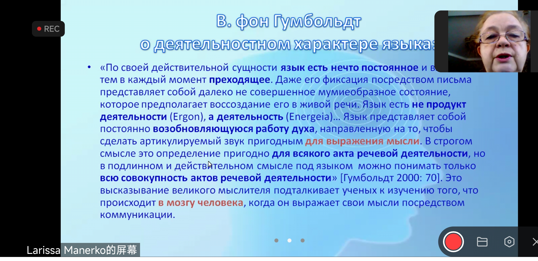 应Betway(西汉姆联)·必威中国俄文系邀请,2022年11月27日15时30至17时,莫斯科大学语言学博士拉丽萨·马涅尔科教授在云端通过ZOOM会议平台为我校师生做了一场主题为“心理语言学的发展特征”的学术讲座。马涅尔科教授现任莫斯科国立大学高翻学院教授、英语理论和实践教研室主任,主要研究方向为语言学的历史与方法论、语言分析方法、认知语言学、英语理论与历史、外语教育等,由于在术语学方面的成就,马涅尔科教授于2007年荣获联合国教科文组织Eugen Wuster奖。