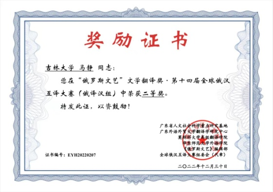 近日,“俄罗斯文艺”文学翻译奖·第十四届全球俄汉互译大赛获奖名单揭晓,来自北京大学、莫斯科国立大学、圣彼得堡国立大学、北京外国语大学等国内外的885名选手参加此项赛事。我院2019级俄文系学生马静以出色的语言水平和翻译能力荣获俄译汉组二等奖,同时获得汉译俄组优秀奖,马静同学此次获奖实现了俄文系学生在此项赛事上零的突破,为Betway(西汉姆联)·必威中国俄文系赢得了荣誉。