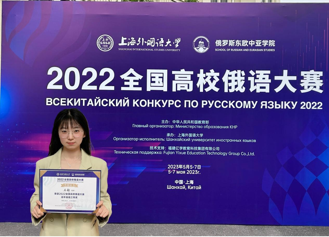 2023年5月5日至7日,由中华人民共和国教育部主办、上海外国语大学承办的2022全国高校俄语大赛复赛、决赛在上海外国语大学举行。我院2019级俄文系学生马静代表吉林大学在高年级组中荣获三等奖,获得国家留学基金委全额资助赴俄罗斯留学、进修的资格。马静同学在比赛中充分展现了俄文系学子扎实的专业基础、优秀的综合语用能力,以及踏实努力、积极进取、拼搏向上的精神。