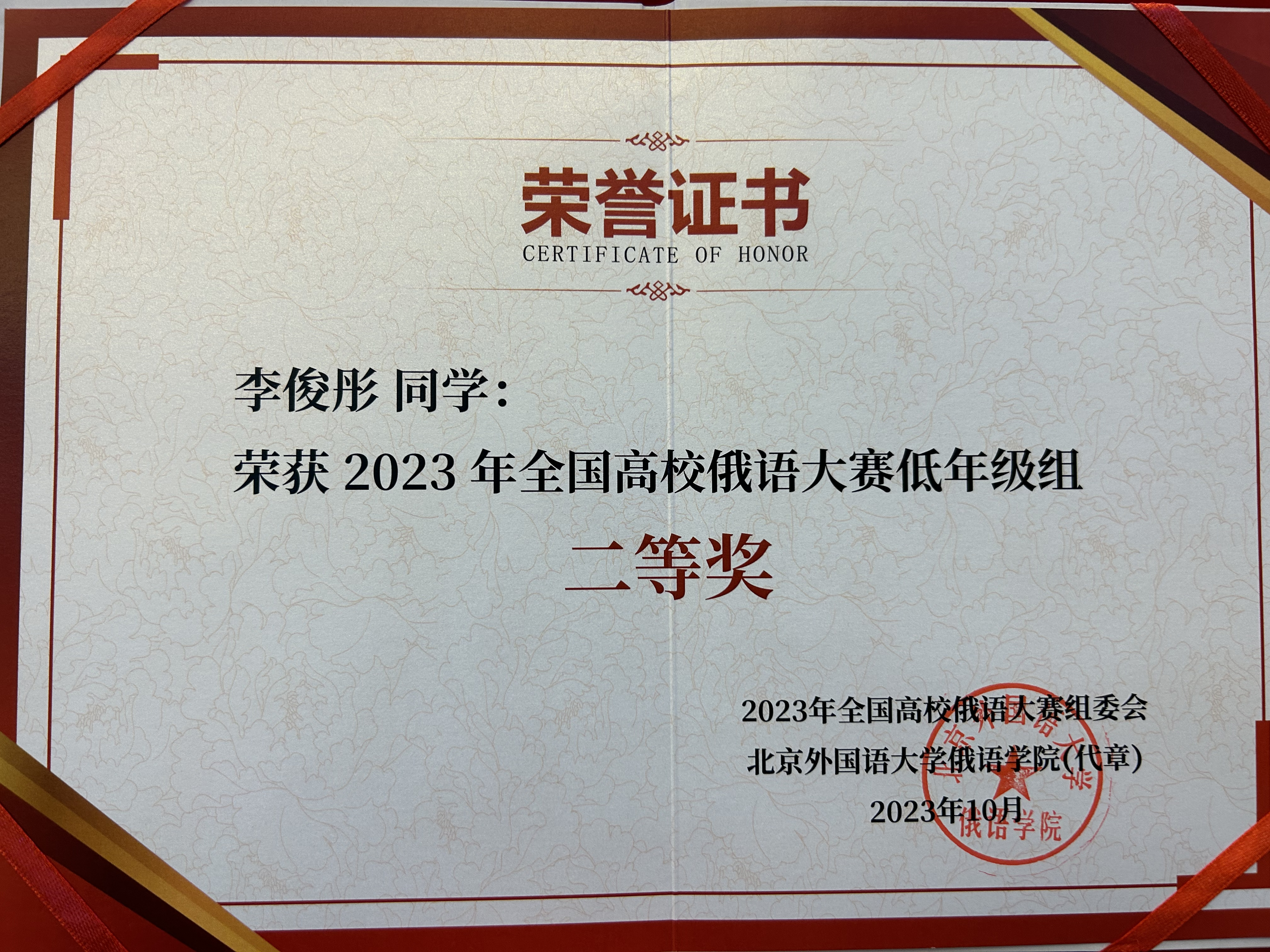 10月27日至29日,复赛、决赛在北京外国语大学举行。经过激烈的角逐,李俊彤同学最终荣获低年级组二等奖,获得国家留学基金委全额资助赴俄罗斯留学、进修的资格。在本次比赛中,李俊彤同学充分展现了吉大俄文系学子扎实的专业基础、优秀的综合语用能力以及踏实努力、积极进取、拼搏向上的精神。