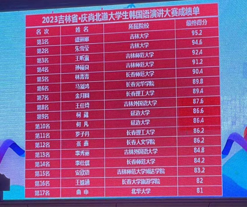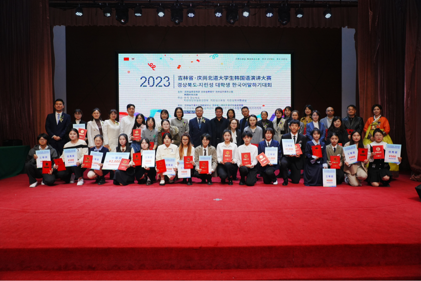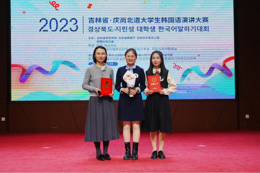 2023年10月31日,由吉林省委宣传部、吉林省教育厅、吉林省外事办公室、韩国庆尚北道主办,吉林省外事办公室翻译中心、吉林省人民对外友好协会亚非部承办的2023吉林省•庆尚北道大学生韩国语演讲大赛在长春乐府酒店举办。来自吉林大学、延边大学等吉林省12所高校的18名参赛选手同台竞技。朝鲜语专业2022级学生盛琳娜和2020级学生朱雪莹在我院朝文系金晶银老师的指导下代表吉林大学参加比赛,初赛入选后在决赛中分别获得第一、第二名。盛琳娜同学荣获一等奖、朱雪莹同学荣获二等奖,盛琳娜同学获得庆尚北道提供的赴韩研学机会。