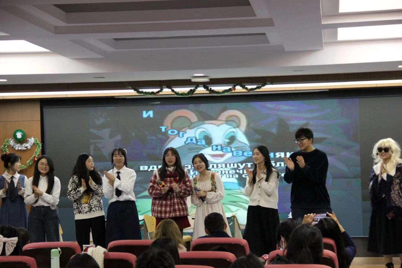 晚会开始,严寒老人和雪姑娘伴着自鸣钟悠扬的钟声走进会场,与晚会观众们热情互动,并分发新年礼物,点燃晚会现场气氛。本次新年联欢晚会,俄文系同学展现了高超的语言模仿能力、精湛的舞台表演功底,呈现了一台精彩纷呈的文娱晚会。影视配音节目中,孙悟空和妖怪的声音惟妙惟肖,游侠与地头蛇的语言透着火药味,后宫娘娘的语言充满宫斗心机;中国传统器乐独奏使人领略到中华民族乐器的魅力,俄语歌曲演唱使人在叹服歌者美妙的声音同时也深深沉浸于俄罗斯音乐之美;根据俄罗斯著名作家作品改编的舞台剧、根据校园生活创造的原创情景剧等节目,让现场观众不时发出会心的笑声。中场游戏环节更是将整个晚会现场气氛推向高潮,所有人都积极参与游戏,现场为获胜者准备了精美奖品,并为所有参与者准备小礼品,增加了晚会的趣味性和互动性。