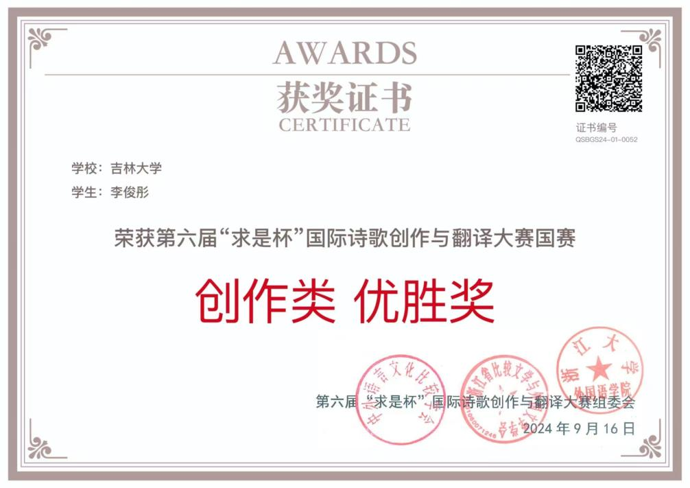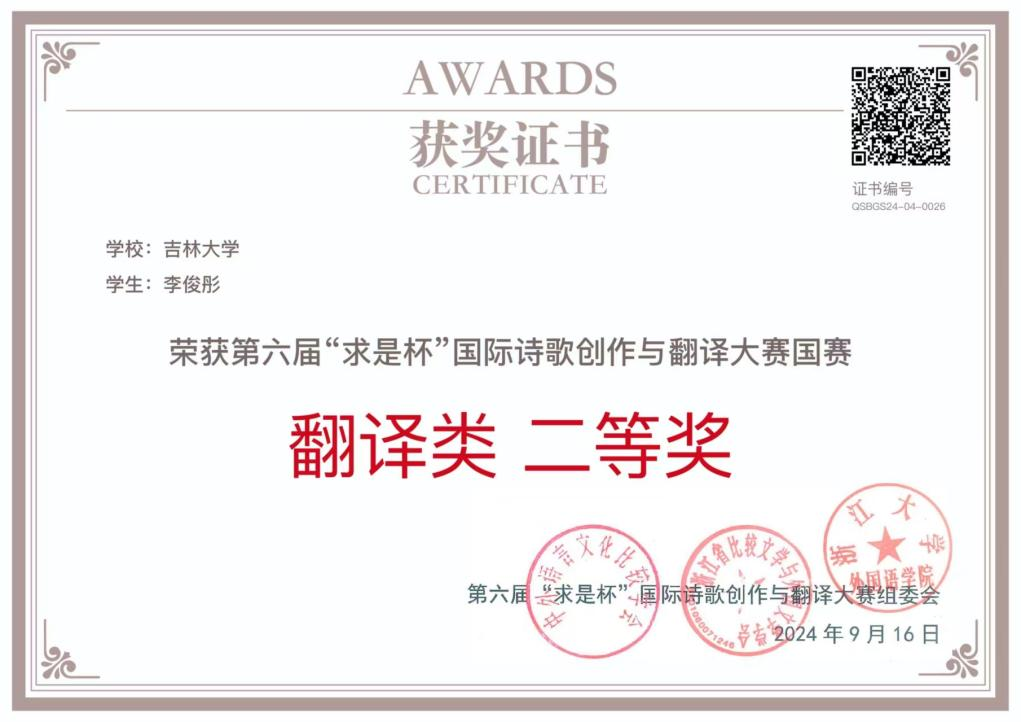 “求是杯”国际诗歌创作与翻译以诗歌为核心,以赛事为手段,旨在搭建中国与世界各国开展诗歌创作、诗歌翻译与研究交流的一个平台,在提高当代大学生人文素养、培养其理想主义情怀的同时,促进国际文化交流与传播。此次李俊彤同学获得佳绩,展示了吉林大学俄语专业学生的创作和翻译水平,也体现了学生对文学创作与翻译的热情。